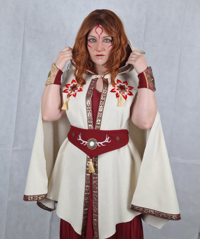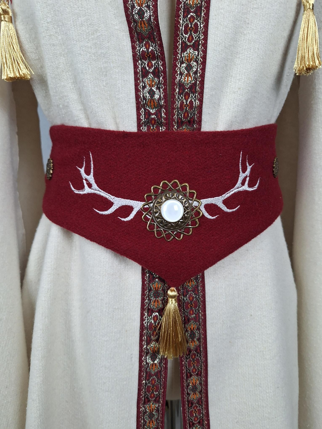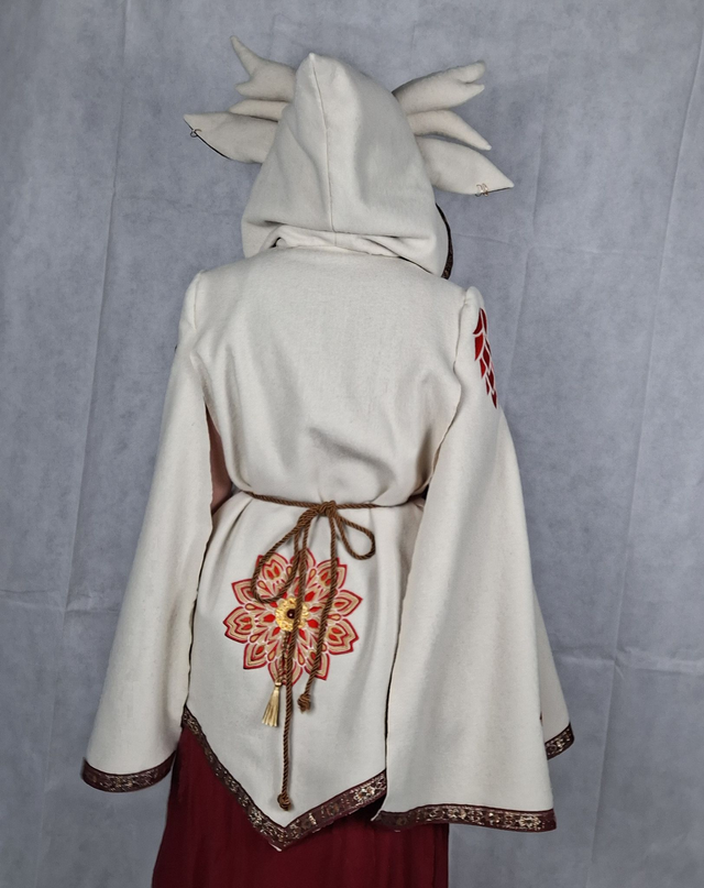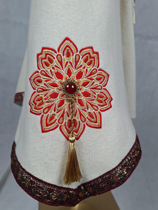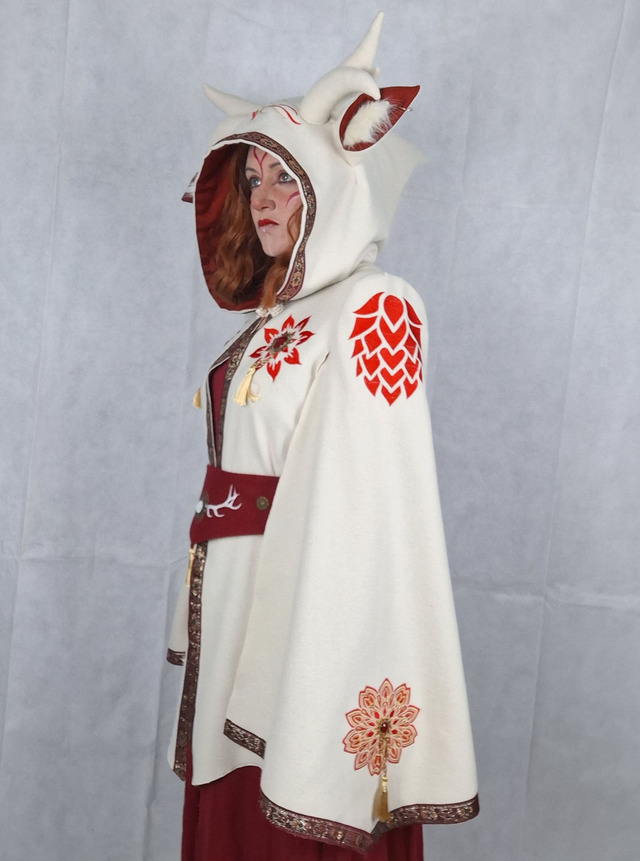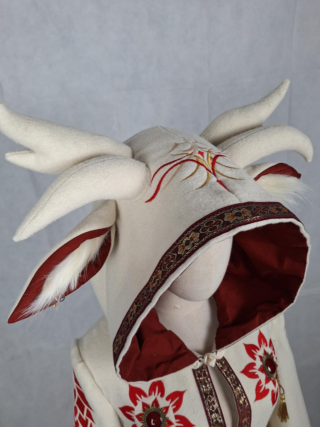 Cape à oreilles et cornes en laine blanche avec capuche a pointe doublée en coton rouge, fermeture brandebourg sur le devant. Une multitudes de broderies ornent cette cape en fil rouge et doré ainsi que des bijoux et pompons cousus à la main. La ceinture en laine rouge brodée est incluse dans l'ensemble.