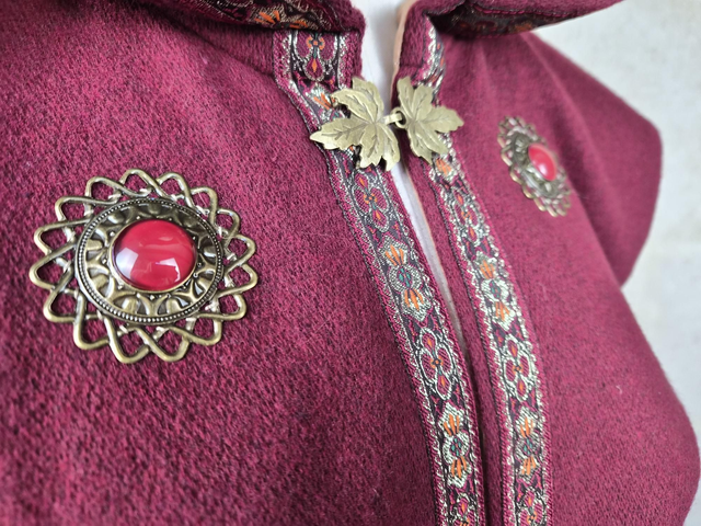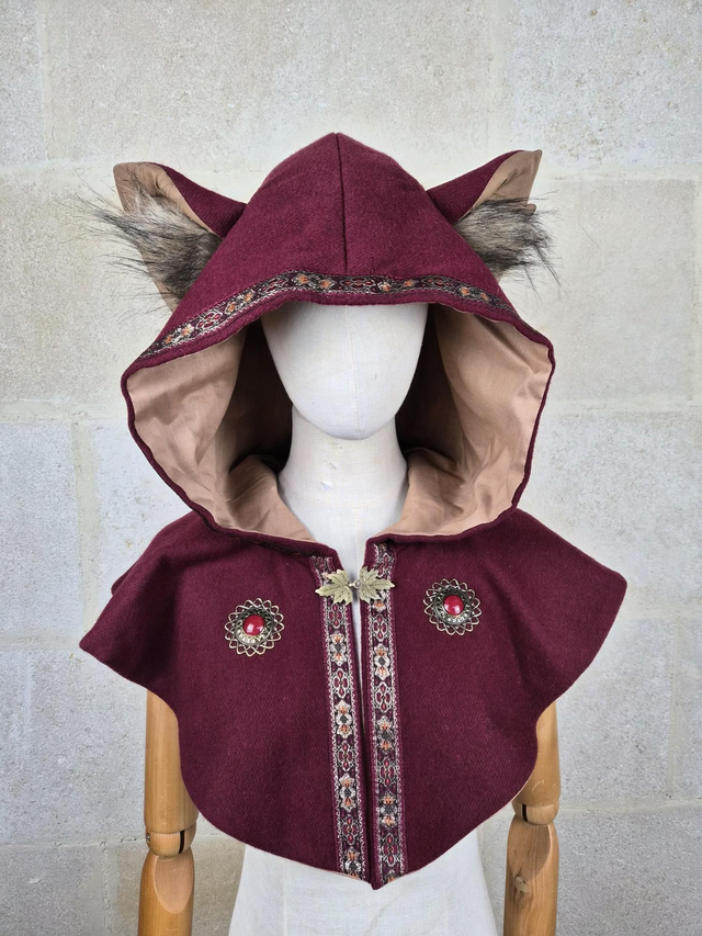 Capuchon à oreilles en laine avec doublure en coton, capuche à pointe, fermoir en métal sur le devant et décoration unique pour chaque modèle. Couvre jusqu'aux épaules. Fabriqué avec soin à partir de laine de bonne qualité, cette cape offre une douceur et une protection face au froid et intempéries. La doublure en coton ajoute une couche de confort supplémentaire, assurant une sensation de bien-être et de douceur.