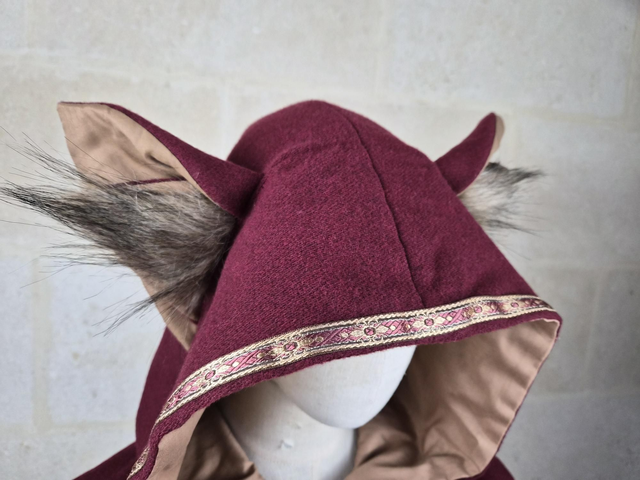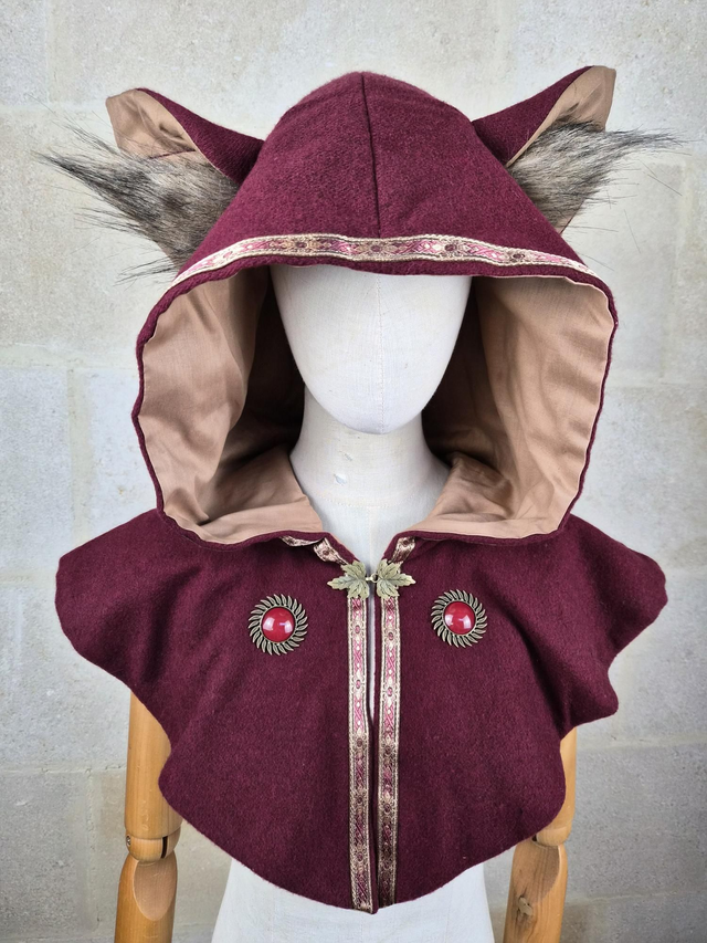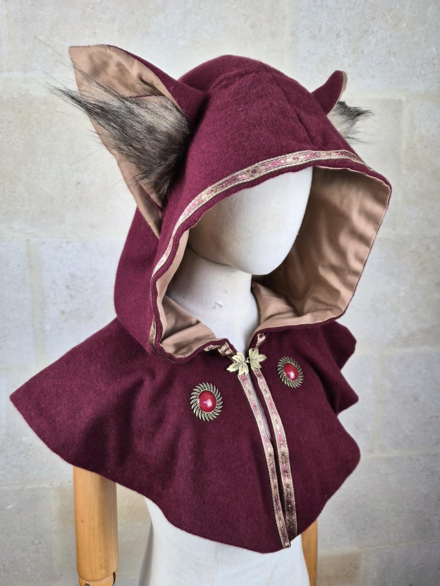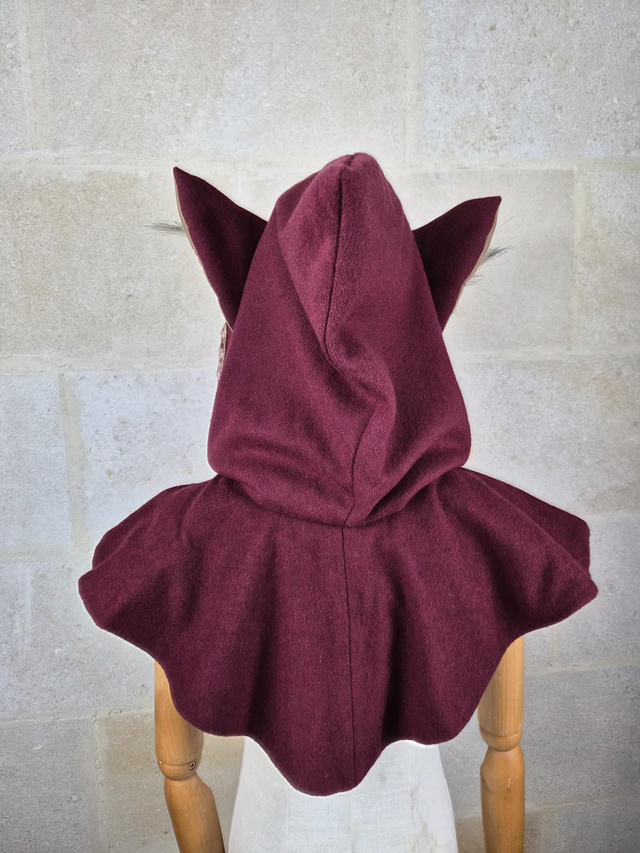 Capuchon à oreilles en laine avec doublure en coton, capuche à pointe, fermoir en métal sur le devant et décoration unique pour chaque modèle. Couvre jusqu'aux épaules. Fabriqué avec soin à partir de laine de bonne qualité, cette cape offre une douceur et une protection face au froid et intempéries. La doublure en coton ajoute une couche de confort supplémentaire, assurant une sensation de bien-être et de douceur.