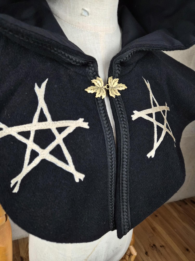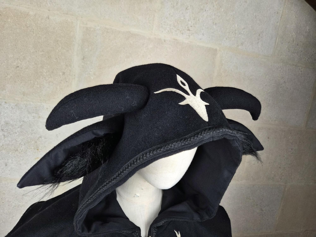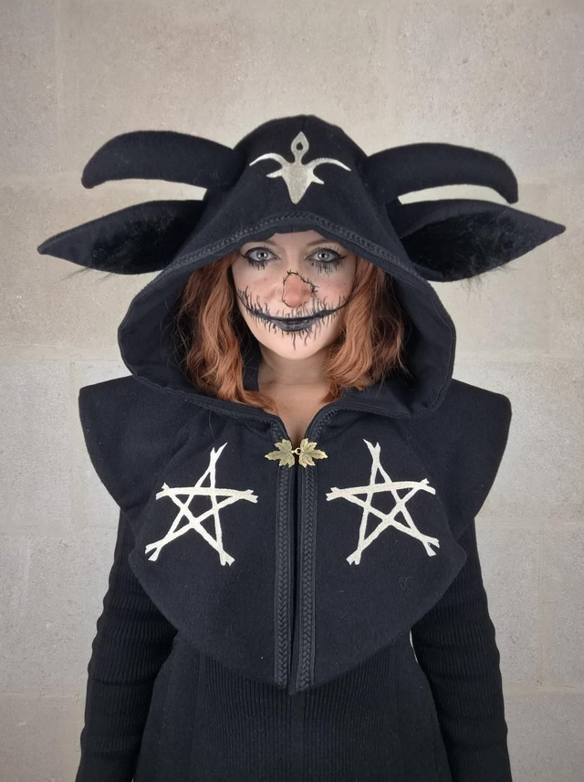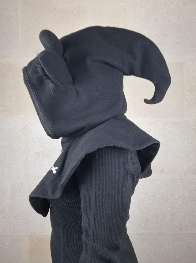 Capuchon à oreilles en laine avec doublure en coton, capuche à pointe, fermoir en métal sur le devant et décoration unique pour chaque modèle. Couvre jusqu'aux épaules. Fabriqué avec soin à partir de laine de bonne qualité, cette cape offre une douceur et une protection face au froid et intempéries. La doublure en coton ajoute une couche de confort supplémentaire, assurant une sensation de bien-être et de douceur.