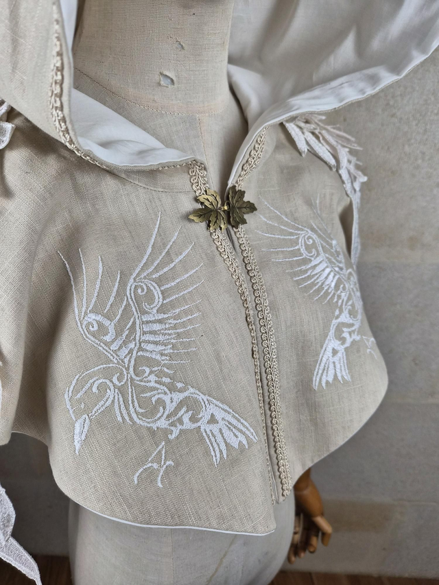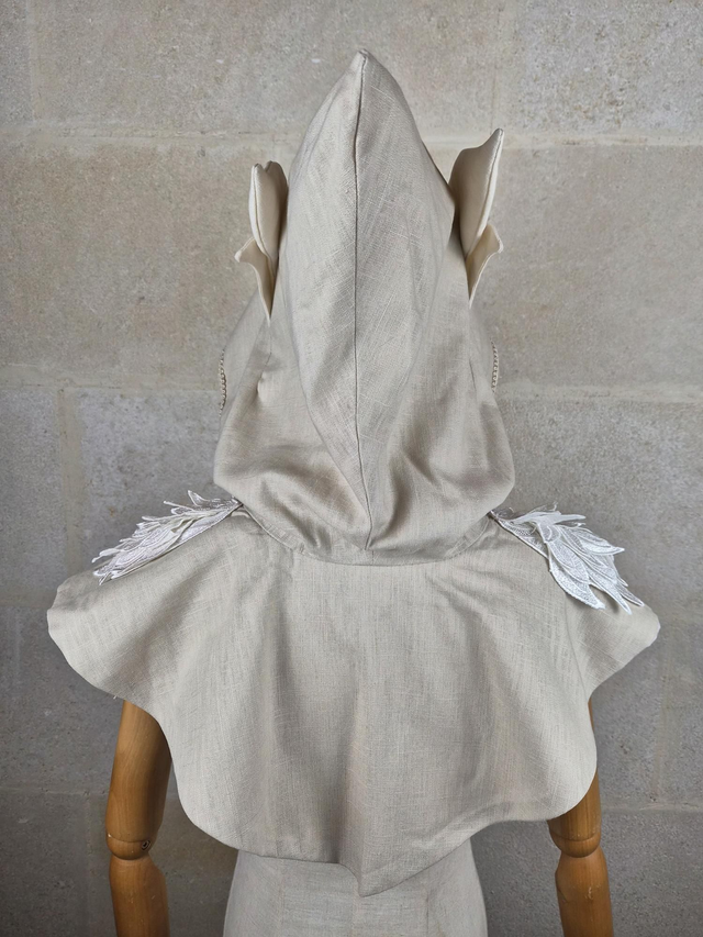 Capuchon à oreilles en lin avec doublure en coton, capuche à pointe, fermoir en métal sur le devant et décoration unique pour chaque modèle. Couvre jusqu'aux épaules. Fabriqué avec soin à partir de lin de bonne qualité, cette cape offre une douceur et une protection face à la chaleur. La doublure en coton ajoute une couche de confort supplémentaire, assurant une sensation de bien-être et de douceur.