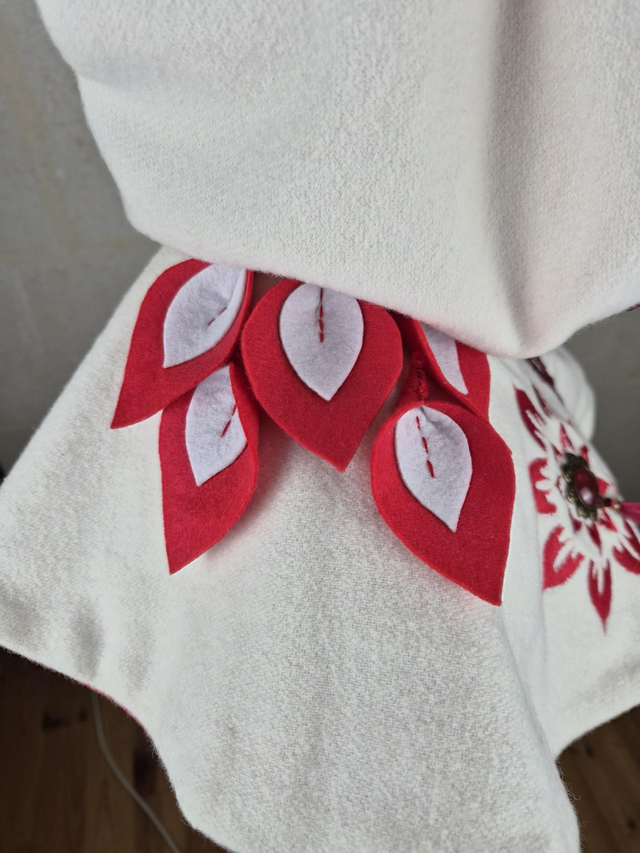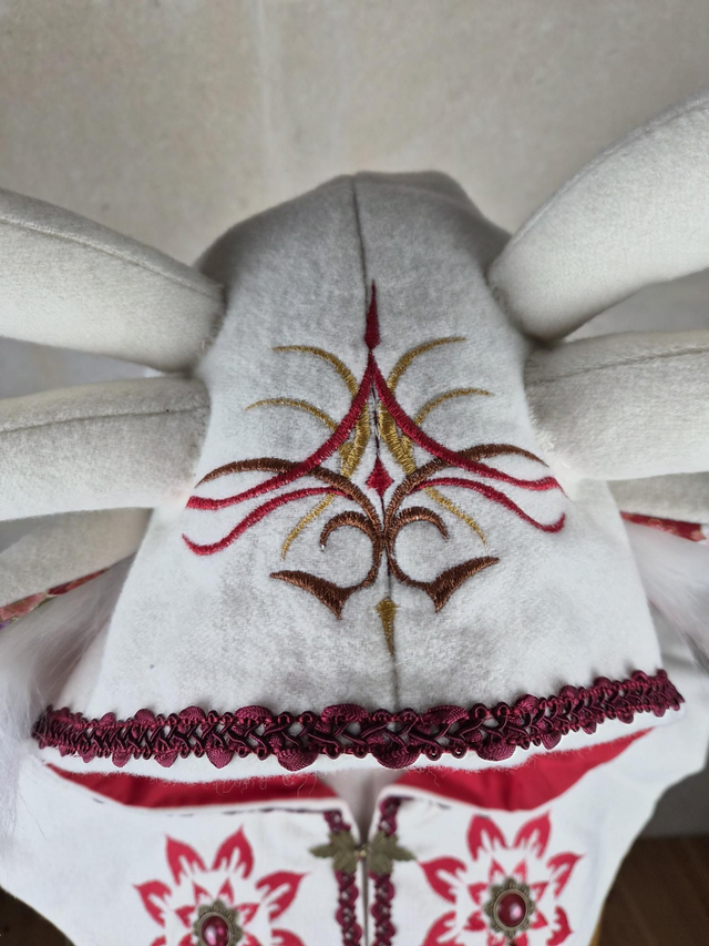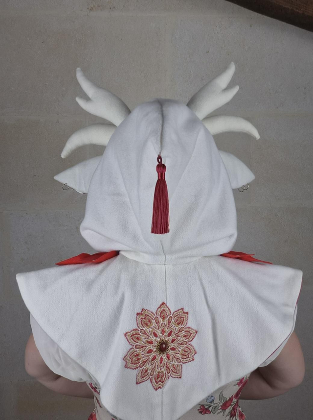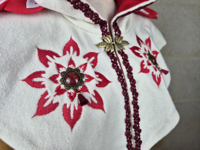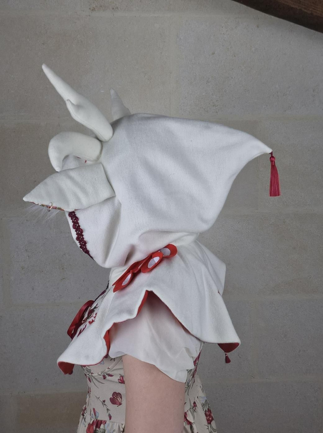 Capuchon à oreilles en laine avec doublure en coton, capuche à pointe, fermoir en métal sur le devant et décoration unique pour chaque modèle. Couvre jusqu'aux épaules. Fabriqué avec soin à partir de laine de bonne qualité, cette cape offre une douceur et une protection face au froid et intempéries. La doublure en coton ajoute une couche de confort supplémentaire, assurant une sensation de bien-être et de douceur.