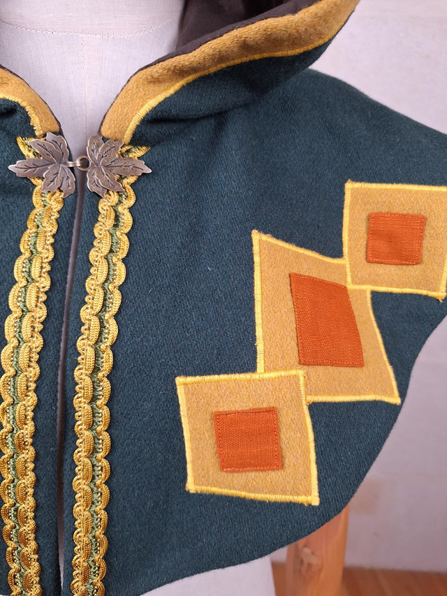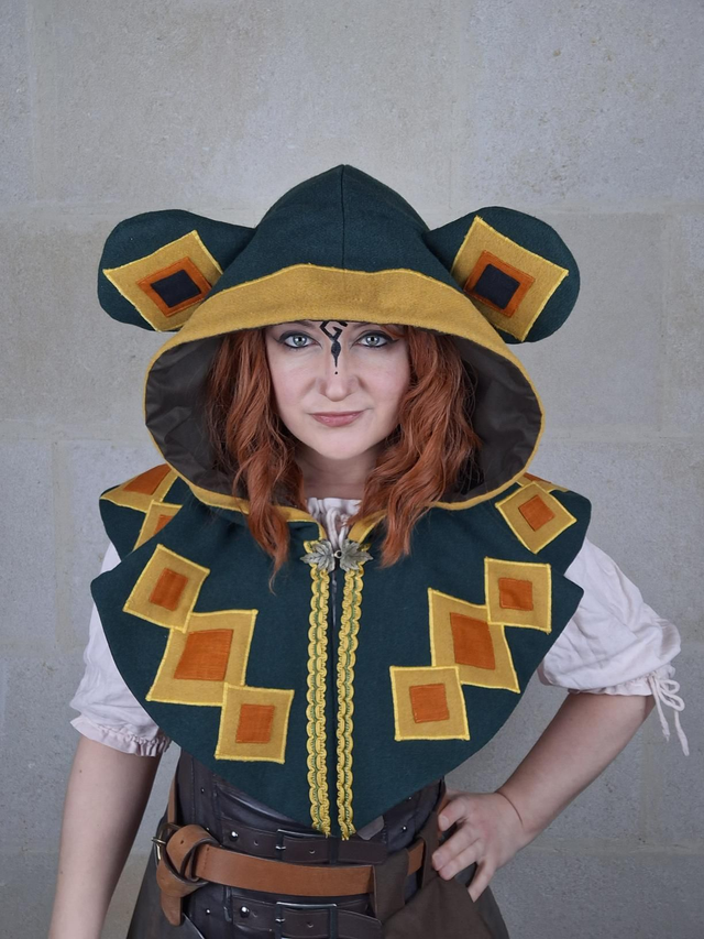 Capuchon à oreilles en laine avec doublure en coton, capuche à pointe, fermoir en métal sur le devant et décoration unique pour chaque modèle. Couvre jusqu'aux épaules. Fabriqué avec soin à partir de laine de bonne qualité, cette cape offre une douceur et une protection face au froid et intempéries. La doublure en coton ajoute une couche de confort supplémentaire, assurant une sensation de bien-être et de douceur.