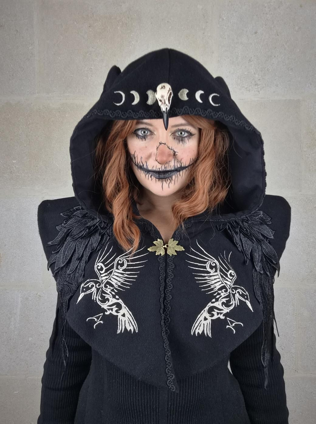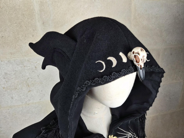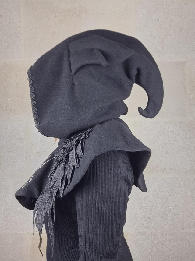 Capuchon à oreilles en laine avec doublure en coton, capuche à pointe, fermoir en métal sur le devant et décoration unique pour chaque modèle. Couvre jusqu'aux épaules. Fabriqué avec soin à partir de laine de bonne qualité, cette cape offre une douceur et une protection face au froid et intempéries. La doublure en coton ajoute une couche de confort supplémentaire, assurant une sensation de bien-être et de douceur.