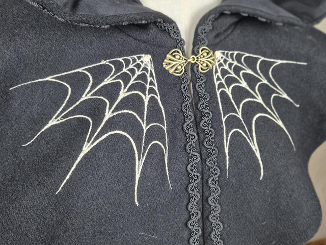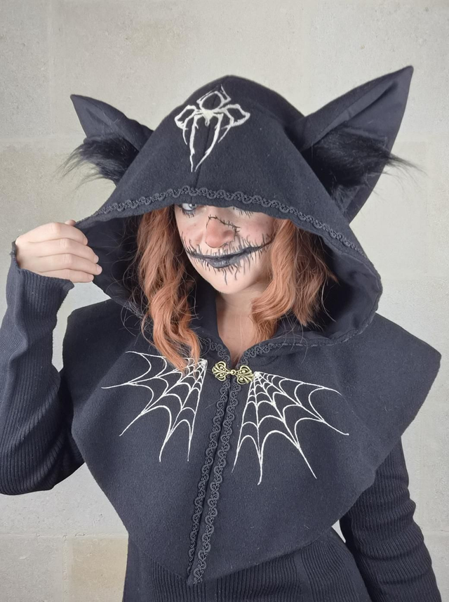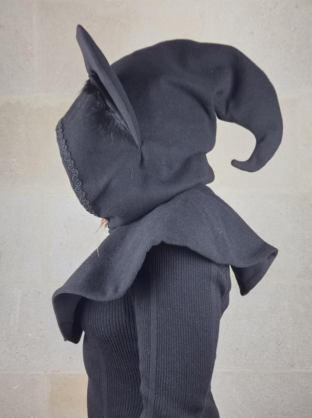 Capuchon à oreilles en laine avec doublure en coton, capuche à pointe, fermoir en métal sur le devant et décoration unique pour chaque modèle. Couvre jusqu'aux épaules. Fabriqué avec soin à partir de laine de bonne qualité, cette cape offre une douceur et une protection face au froid et intempéries. La doublure en coton ajoute une couche de confort supplémentaire, assurant une sensation de bien-être et de douceur.
