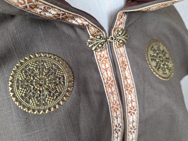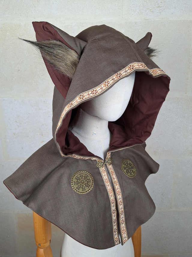 Capuchon à oreilles en lin avec doublure en coton, capuche à pointe, fermoir en métal sur le devant et décoration unique pour chaque modèle. Couvre jusqu'aux épaules. Fabriqué avec soin à partir de lin de bonne qualité, cette cape offre une douceur et une protection face à la chaleur. La doublure en coton ajoute une couche de confort supplémentaire, assurant une sensation de bien-être et de douceur.