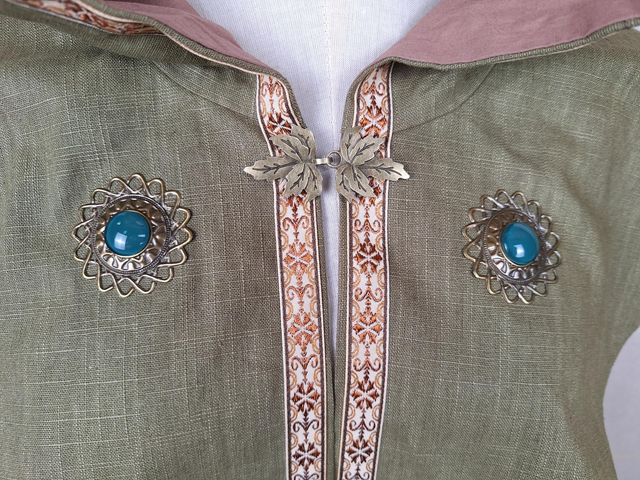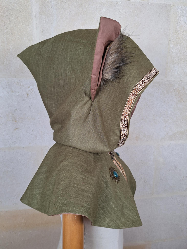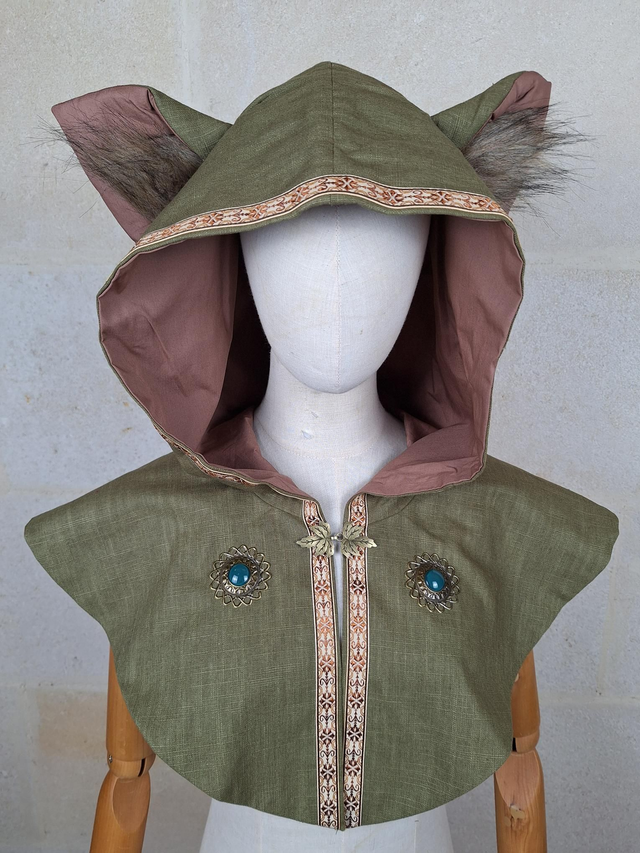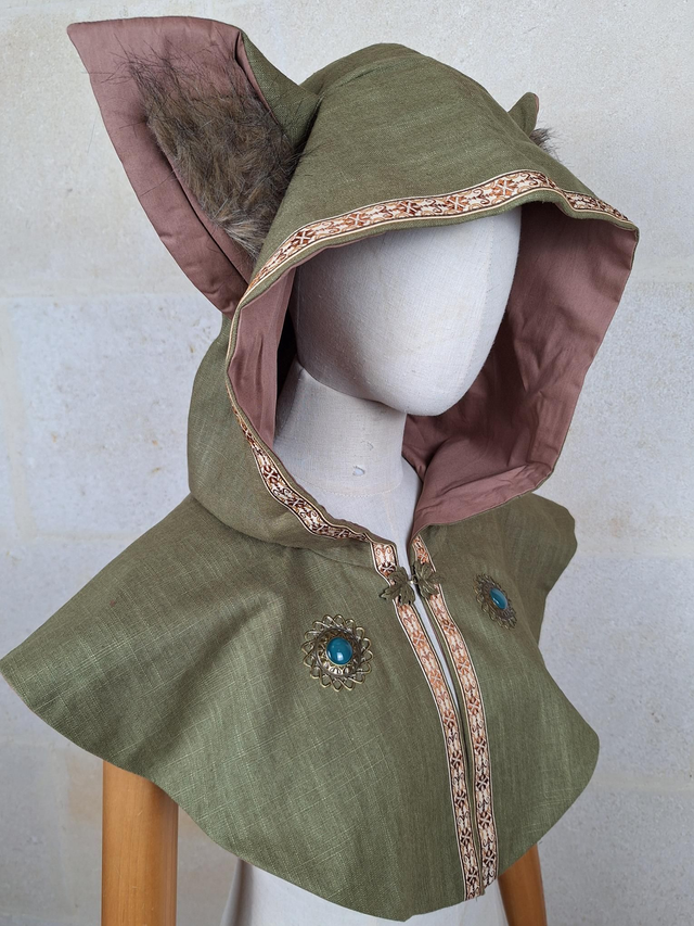 Capuchon à oreilles en lin avec doublure en coton, capuche à pointe, fermoir en métal sur le devant et décoration unique pour chaque modèle. Couvre jusqu'aux épaules. Fabriqué avec soin à partir de lin de bonne qualité, cette cape offre une douceur et une protection face à la chaleur. La doublure en coton ajoute une couche de confort supplémentaire, assurant une sensation de bien-être et de douceur.